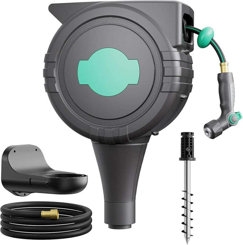 This automatic retractable garden hose reel combines convenience and durability with its 82-foot reach, UV-resistant materials, and precision locking system. Designed for both ground and wall mounting, it offers smooth operation and tangle-free storage, making it ideal for large yards or tight spaces alike.