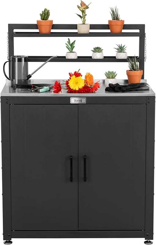 1. Garden Potting Bench with Storage Cabinet & Stainless Steel Tabletop