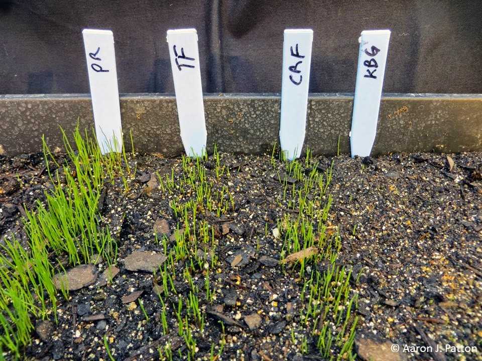 The grass shoots emerge above the soil surface, signaling that germination is complete and initial growth has begun.
