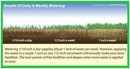 Apply enough water so that it reaches at least six inches into the soil. Deep roots provide a more drought-resistant lawn, and this can be achieved with infrequent, longer watering sessions.