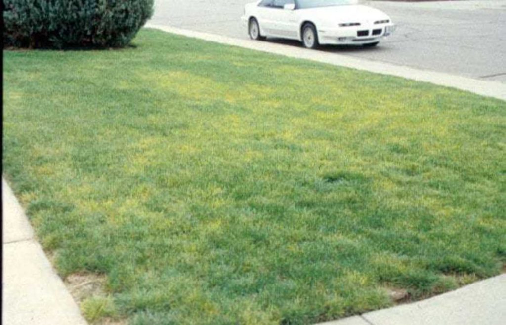 - Pale or yellow patches throughout the lawn