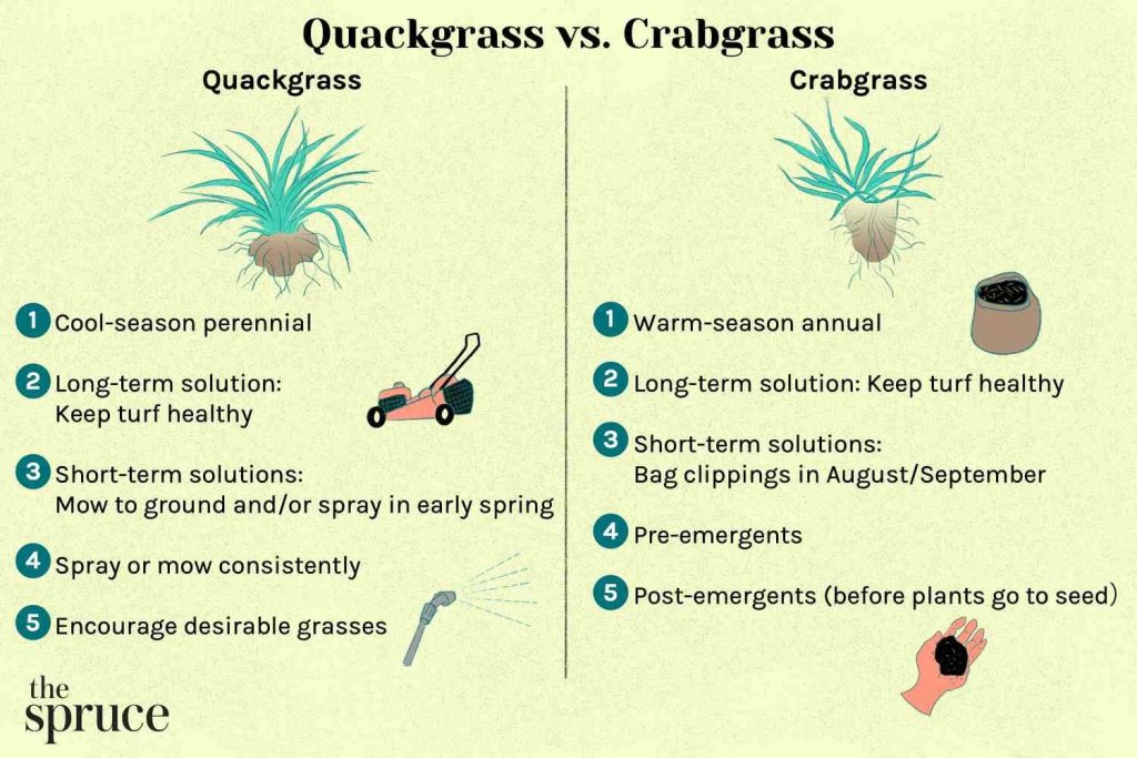 - Life cycle: Crabgrass is an annual weed, germinating from seeds each year, while quackgrass is a perennial weed that regrows from its extensive rhizome system.