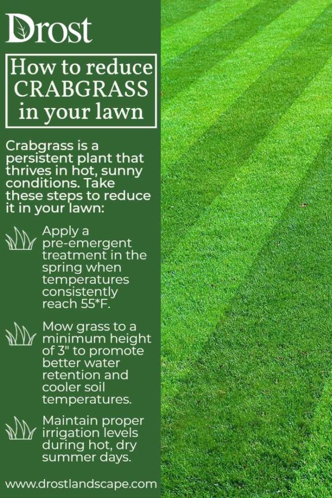 - Water your lawn deeply and infrequently, encouraging deep root growth of your grass. Avoid frequent shallow watering that can promote crabgrass germination.