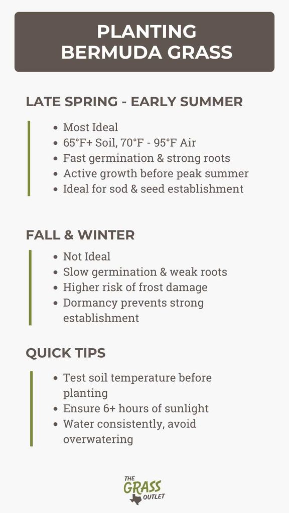 Even in warmer regions, late spring frosts can damage young Bermuda grass. Wait until the threat of frost has passed entirely, usually after temperatures stay above freezing consistently.
