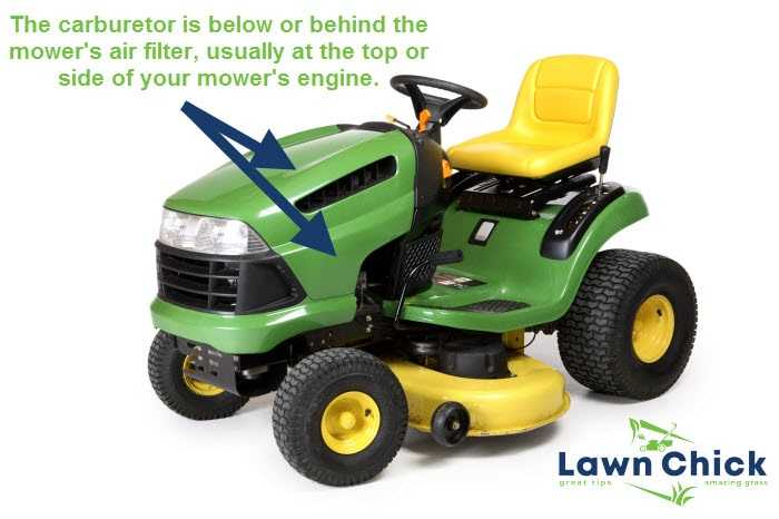 Quick Answer: The carburetor on a riding lawn mower is typically located near the engine in the front or side of the machine.